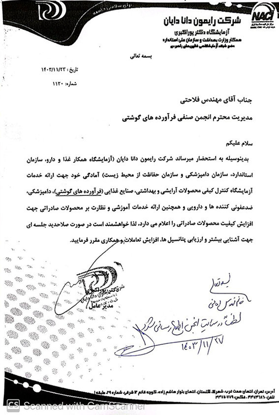 شرکت رایمون دانا دایان آزمایشگاه همکار غذا و دارو، سازمان استاندارد، سازمان دامپزشکی و سازمان حفاظت از محیطزیست به اعضای انجمن صنایع فرآوردههای گوشتی ایران خدمات آزمایشگاهی کنترل کیفی ارایه میدهد.