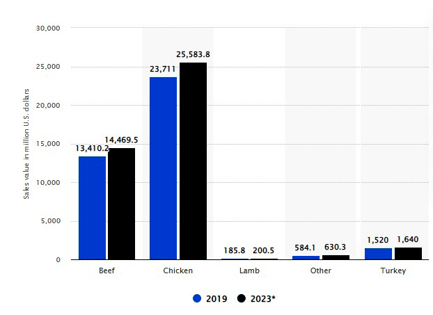 افزودنی است در سال 2023 میلادی، ارزش فروش سوسیس مرغ در این بازار 25583.8 میلیون دلار به ثبت رسید که در مقایسه با سوسیس گوشت بره با ارزش فروش 200.5 میلیون دلاری سهم بیشتری را در این بازار بهدست آورده است.