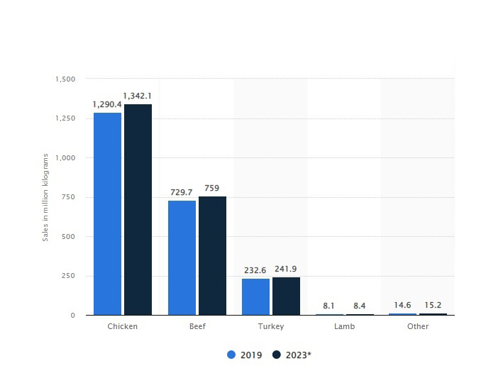 افزودنی است حجم فروش سوسیس مرغ در طی 2 سال 2019 و 2023میلادی به ترتیب 1290.4 و