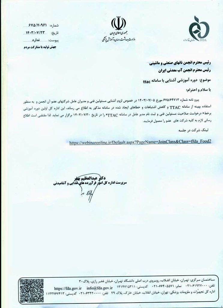اولین دوره آموزشی برخط درخواست صلاحیت مسئولان فنی و ثبت نام مدیرعامل در سامانه TTAC، سیام مهرماه امسال توسط ادارهکل امور فرآوردههای غذایی و آشامیدنی وزارت بهداشت، درمان و آموزش پزشکی برگزار میشود.
