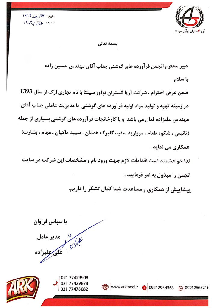 به گزارش روابط عمومی انجمن صنایع فرآورده‌های گوشتی ایران علی علیزاده، مدیرعامل این شرکت با ارسال نامه‌ای به دبیر انجمن جهت تأمین نیازهای اعضای انجمن اعلام آمادگی کرده است.