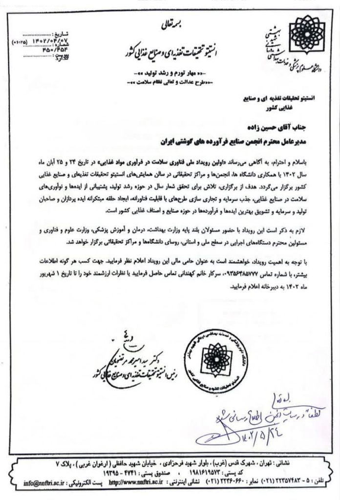 «اولین رویداد ملی فناوری سلامت در فرآوری مواد غذایی» 24 و 25 آبان‌ماه با همکاری دانشگاه‌ها، انجمن‌ها و مراکز تحقیقات در سالن همایش‌های انستیتو تحقیقات تغذیه‌ای و صنایع غذایی کشور برگزار می‌شود.