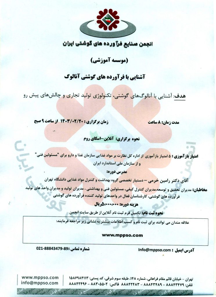 بر پایه این گزارش دکتر رامین خرمی، دستیار تخصصی گروه بهداشت و کنترل مواد غذایی دانشگاه تهران، مدرس این دوره آموزشی است و مدیران تحقیق و توسعه، مدیران کنترل کیفی، مسئولین فنی و بهداشتی، مدیران تولید و مدیران واحدهای تولید فرآوردههای گوشتی و کارشناسان فعال در واحدهای تولیدکننده فرآوردههای گوشتی مخاطبان این دوره آموزشی خواهند بود.