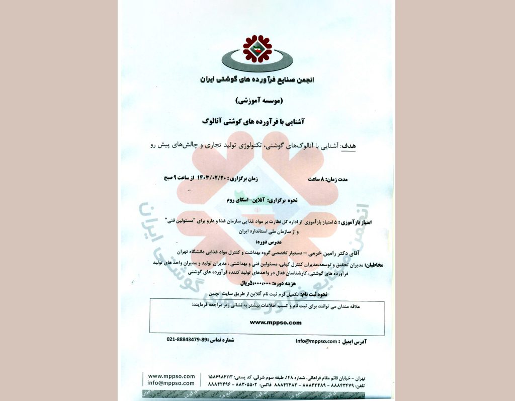 بر پایه این گزارش دکتر رامین خرمی، دستیار تخصصی گروه بهداشت و کنترل مواد غذایی دانشگاه تهران، مدرس این دوره آموزشی است و مدیران تحقیق و توسعه، مدیران کنترل کیفی، مسئولین فنی و بهداشتی، مدیران تولید و مدیران واحدهای تولید فرآوردههای گوشتی و کارشناسان فعال در واحدهای تولیدکننده فرآوردههای گوشتی مخاطبان این دوره آموزشی خواهند بود.