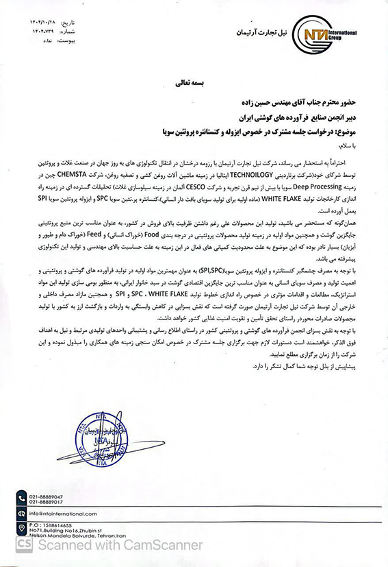 شرکت نیل تجارت آرتیمان با ارسال نامهای به دبیر انجمن صنایع فرآوردههای گوشتی درخواست برگزاری جلسه مشترک درخصوص راهاندازی خط تولید ایزوله و کنسانتره پروتئین سویا را مطرح کرد.