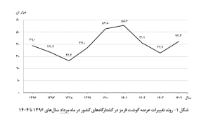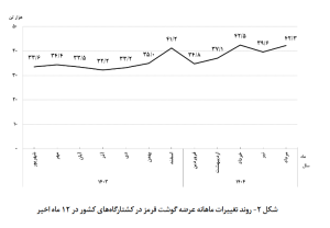 مقایسه عملکرد کشتارگاههای رسمی کشور در مرداد ۱۴۰۴ با ماه مشابه سال ۱۴۰۳ نشاندهنده افزایش ۲۸ درصدی مقدار عرضه گوشت قرمز در کشتارگاههای رسمی کشور است؛ مقدار تولید گوشت در مرداد ۱۴۰۴ نسبت به ماه مشابه سال ۱۴۰۳ برای گوسفند و بره ۲۹ درصد، برای بز و بزغاله ۴ درصد، برای گاو و گوساله ۳۲ درصد، برای گاومیش و بچهگاومیش ۵۹ درصد و برای شتر و بچهشتر ۳ درصد افزایش داشته است.