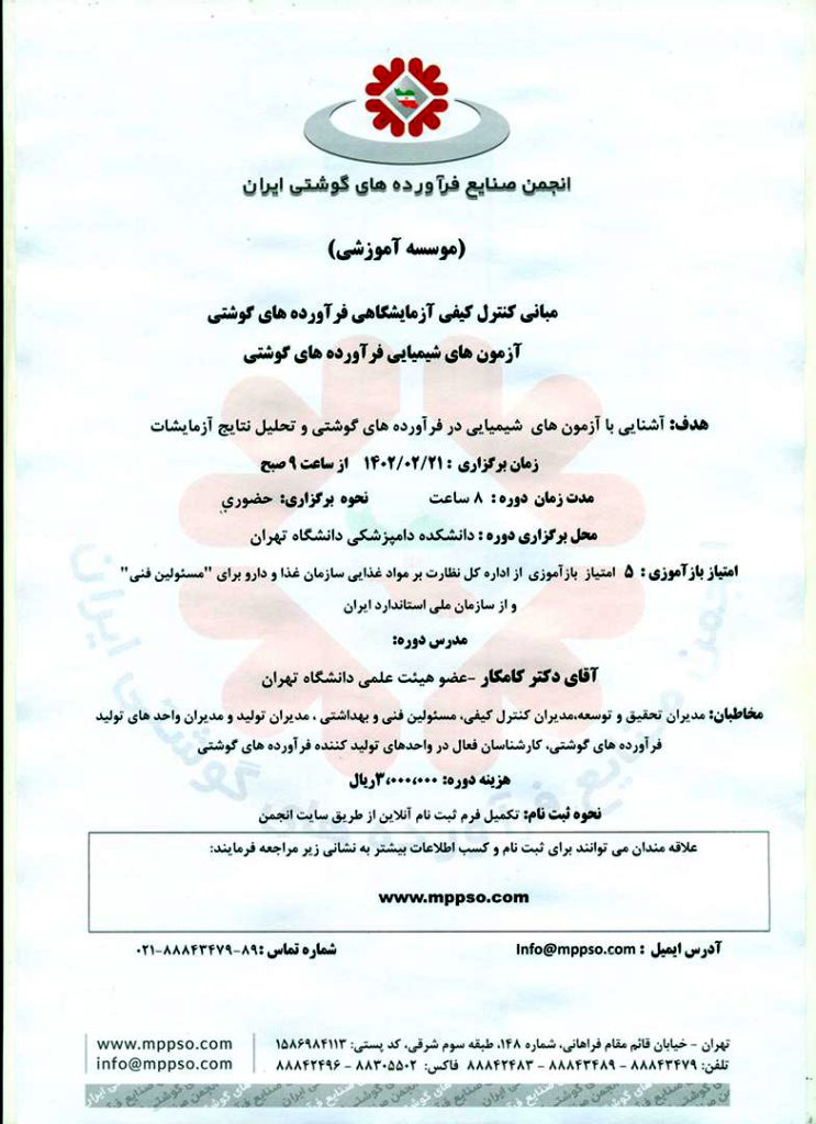 دوره آموزشی آشنایی با آزمون‌های شیمیایی در فرآورده‌های گوشتی و تحلیل نتایج آزمایشات 5 شنبه 21 اردیبهشت‌ماه برگزار می‌شود.