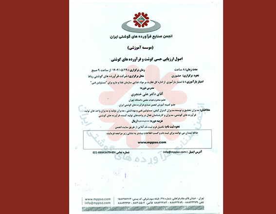 دوره آموزشی اصول ارزیابی حسی گوشت و فرآورده‌های گوشتی چهارشنبه 29 مردادماه در شرکت فرآورده‌های گوشتی رباط برگزار می‌شود.