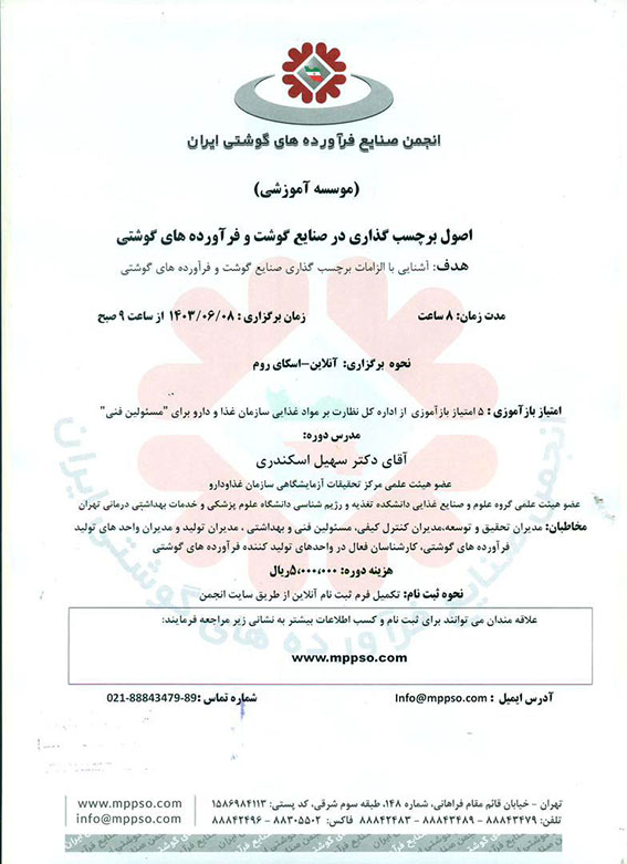 دوره آموزشی اصول برچسبگذاری در صنایع گوشت و فرآوردههای گوشتی 5 شنبه 8 شهریورماه بهصورت آنلاین - اسکای روم برگزار میشود.