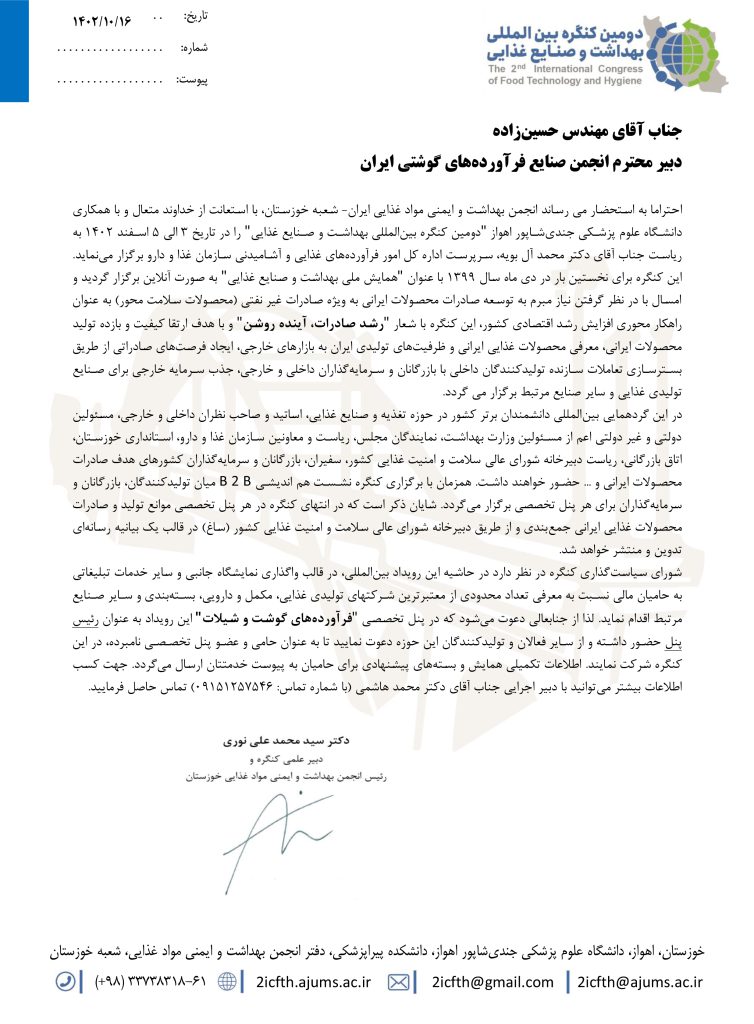 به گزارش روابط عمومی انجمن صنایع فرآوردههای گوشتی ایران این کنگره توسط انجمن بهداشت و ایمنی موادغذایی ایران – شعبه خوزستان و با همکاری دانشگاه علوم پزشکی جندیشاپور اهواز و با شعار محوری «رشد صادرات، آینده روشن» برگزار میشود.