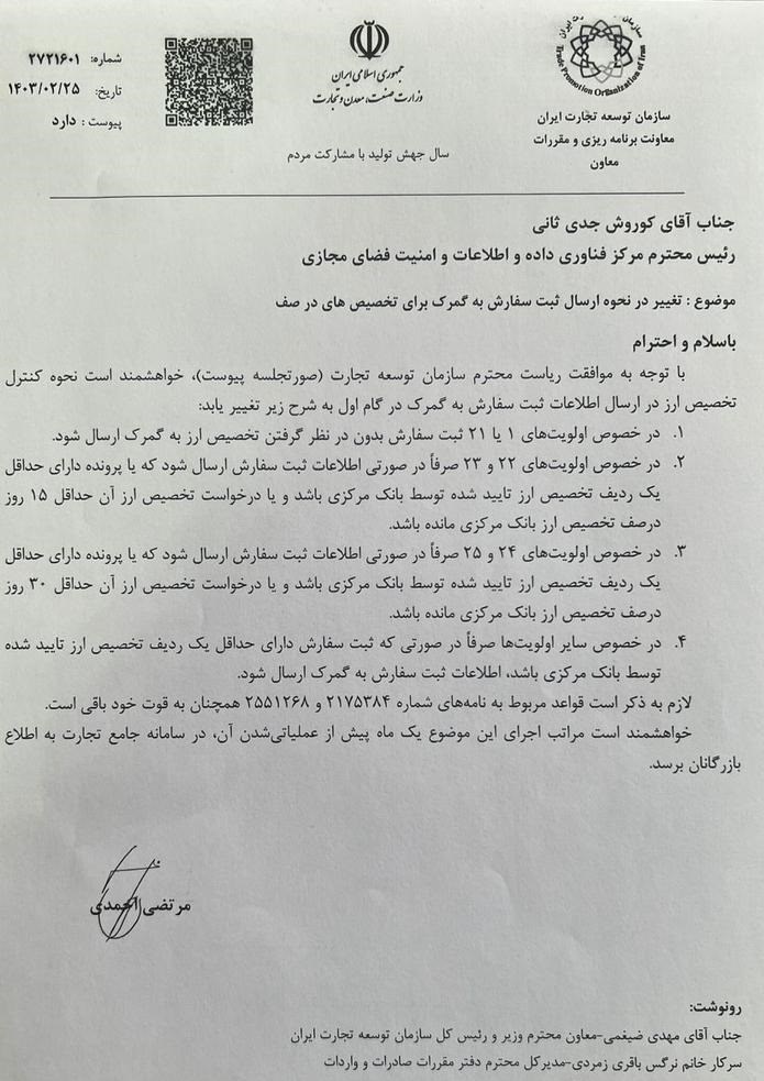 لازم به ذکر است قواعد مربوط به نامه های شماره 2175384 و 2551268 همچنان به قوت خود باقی است. خواهشمند است مراتب اجرای این موضوع یک ماه پیش از عملیاتی شدن آن در سامانه جامع تجارت به اطلاع بازرگانان برسد.