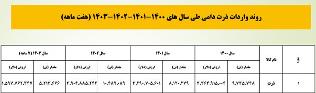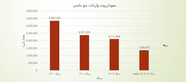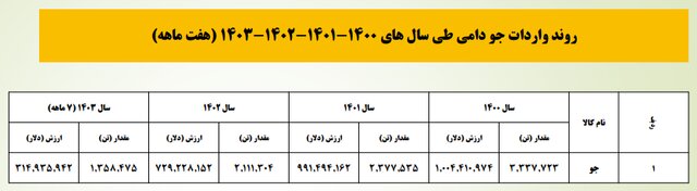 بر اساس این آمارها، میزان واردات جو دامی در سال ۱۴۰۰حدود ۳ میلیون و ۳۳۷ هزار و ۷۲۳ تن به ارزش یک میلیارد و ۴ میلیون و ۴۱۰ هزار و ۹۷۴ دلار، در سال ۱۴۰۱ میزان واردات ۲ میلیون و ۳۷۷ هزار و ۵۳۵ تن و به ارزش ۹۹۱ میلیون و ۴۹۴ هزار و ۱۶۲ دلار، در سال ۱۴۰۲ به میزان ۲ میلیون و ۱۱۱ هزار و ۳۰۴ تن و به ارزش ۷۲۹ میلیون و ۲۲۸ هزار و ۱۵۲ دلار و در سال بازه زمانی هفت ماهه سال ۱۴۰۳ به مقدار یک میلیون و ۳۵۸ هزار و ۴۷۵ تن و به ارزش ۳۱۴ میلیون و ۹۳۵ هزار و ۹۴۲ دلار بوده است.