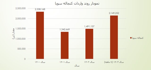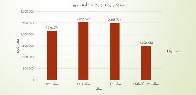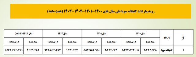 دانه سویا در سال ۱۴۰۰ به میزان ۲ میلیون و ۱۴۶ هزار و ۲۷۴ تن و به ارزش یک میلیاردو ۴۱۴ میلیون و یک هزار و ۹۳۳ دلار ، در سال ۱۴۰۰ به میزان ۲ میلیون و ۴۸۸ هزار و ۷۲۶ تن و به ارزش یک میلیارد و ۷۷۵ میلیون و ۵۳۲ هزار و ۸۳۷ دلار و در هفت ماهه اول سال جاری به میزان یک میلیون و ۵۰۰ هزار و ۴۵۳ دلار به ارزش ۹۰۶ میلیون و ۷۶۲ هزار و ۲۹۱ دلار به کشور وارد شده است.