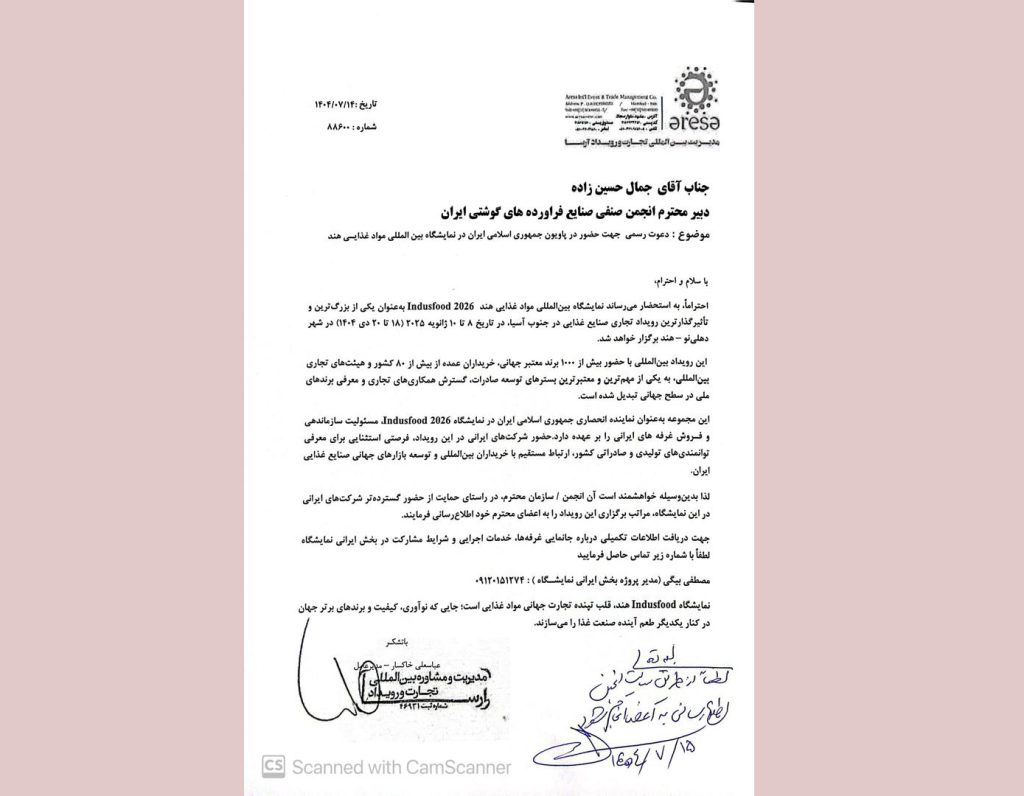 به گزارش روابط عمومی انجمن صنایع فرآوردههای گوشتی ایران در این دعوتنامه آمده است: «نمایشگاه بینالمللی مواد غذایی هند 2026 Indusfood بهعنوان یکی از بزرگترین و تأثیرگذارترین رویداد های تجاری صنایع غذایی در جنوب آسیا در تاریخ ۸ تا ۱۰ ژانویه ۲۰۲۵ (۱۸ تا ۲۰ دی ۱۴۰۴) در شهر دهلی نو – هند برگزار خواهد شد و این رویداد بین المللی با حضور بیش از یک هزار برند معتبر جهانی وخریداران عمده از بیش از ۸۰ کشور و هیأتهای تجاری بینالمللی به یکی از مهمترین و معتبرترین بسترهای توسعه صادرات گسترش همکاریهای تجاری و معرفی برندهای ملی در سطح جهانی تبدیل شده است.»